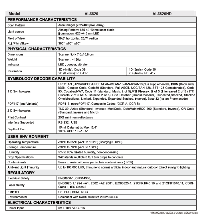 With the rising trend of mobile devices, each device will be required to transmit data through a different platform and it is becoming the norm. Barcode is digitalized and it will be displayed on a variety of electronic devices. AI-6820 Series has high readability on electronic displays like a tablet and cell phones to have high accuracy barcode reading ability. AI-6820 Series is the ideal product for you to apply with different sectors such as Retail, Logistic, Warehouse management and so on.
