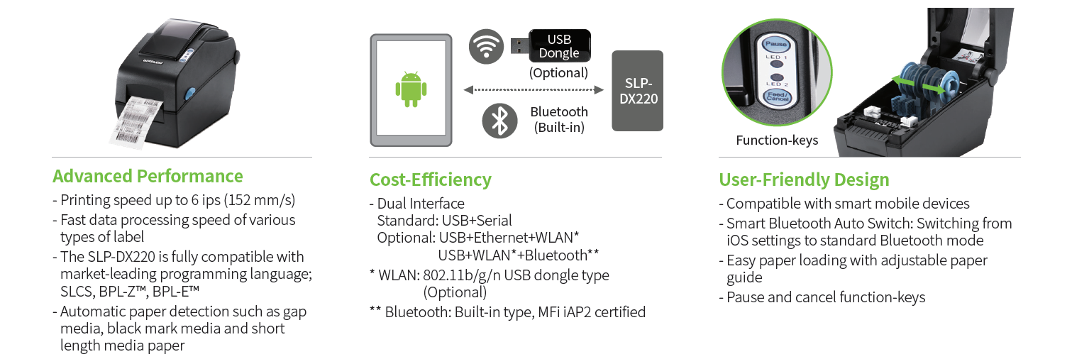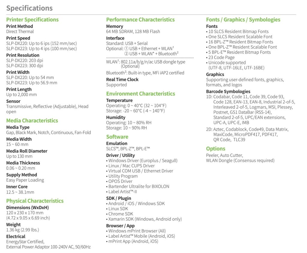 The Bixolon SLP-DX220 is a premium, 2-inch direct thermal desktop printer designed for high-efficiency labeling in healthcare, retail, and hospitality. Its slim “Shell Suit” design saves workspace while offering industrial-grade speeds of 6 ips (152mm/s). It is highly versatile, supporting everything from patient wristbands and pharmacy labels to order tags and 2D barcodes.