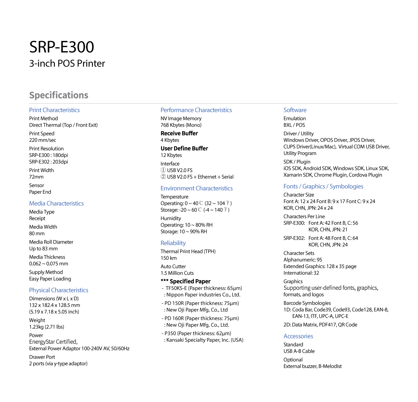The Bixolon SRP-E300 is an entry-level, 3-inch (80mm) thermal POS printer designed as a more compact and cost-efficient alternative to the industry-standard SRP-330II. It is 10% smaller than its predecessor, making it an excellent fit for tight checkout counters. Despite its smaller footprint, it maintains a rapid print speed of 220mm/s and high reliability, featuring a 1.5 million cuts auto-cutter.