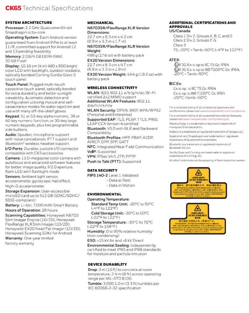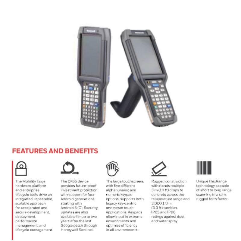 The Honeywell CK65 is an ultra-rugged mobile computer designed to accelerate productivity in demanding warehouse and manufacturing environments. Built on the Mobility Edge™ platform, it features a 4-inch Gorilla Glass touchscreen, tactile keypad, and a massive 28-hour battery life. With IP65/IP68 ratings and 3-meter drop durability, it offers future-proof performance for long-range scanning and heavy-duty workflows.
