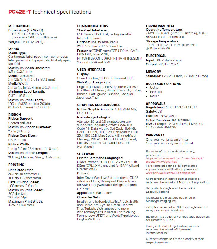 The Honeywell PC42E-T is a compact, high-speed desktop printer delivering 203 or 300 dpi resolution at up to 6 ips. Built for reliability, it features a unique ECO button for waste reduction and effortless media loading. With versatile connectivity—including Ethernet, USB, and optional Wi-Fi/Bluetooth—it provides a modern, manageable solution for retail, logistics, and light manufacturing workflows