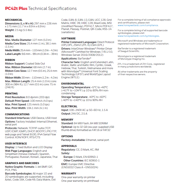 Honeywell PC42T Plus 4-inch Desktop Printer