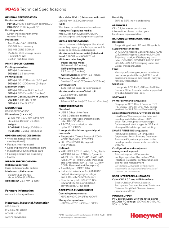 The Honeywell PD45S is a high-performance industrial printer featuring an all-metal frame and a powerful 800MHz Arm Cortex-A7 processor. It delivers speeds up to 10 ips with a patented dual-sensor positioning technology that ensures ±0.5 mm accuracy for labels as small as 5 mm. Built for durability, it excels in manufacturing, retail, and logistics with minimal maintenance requirements.