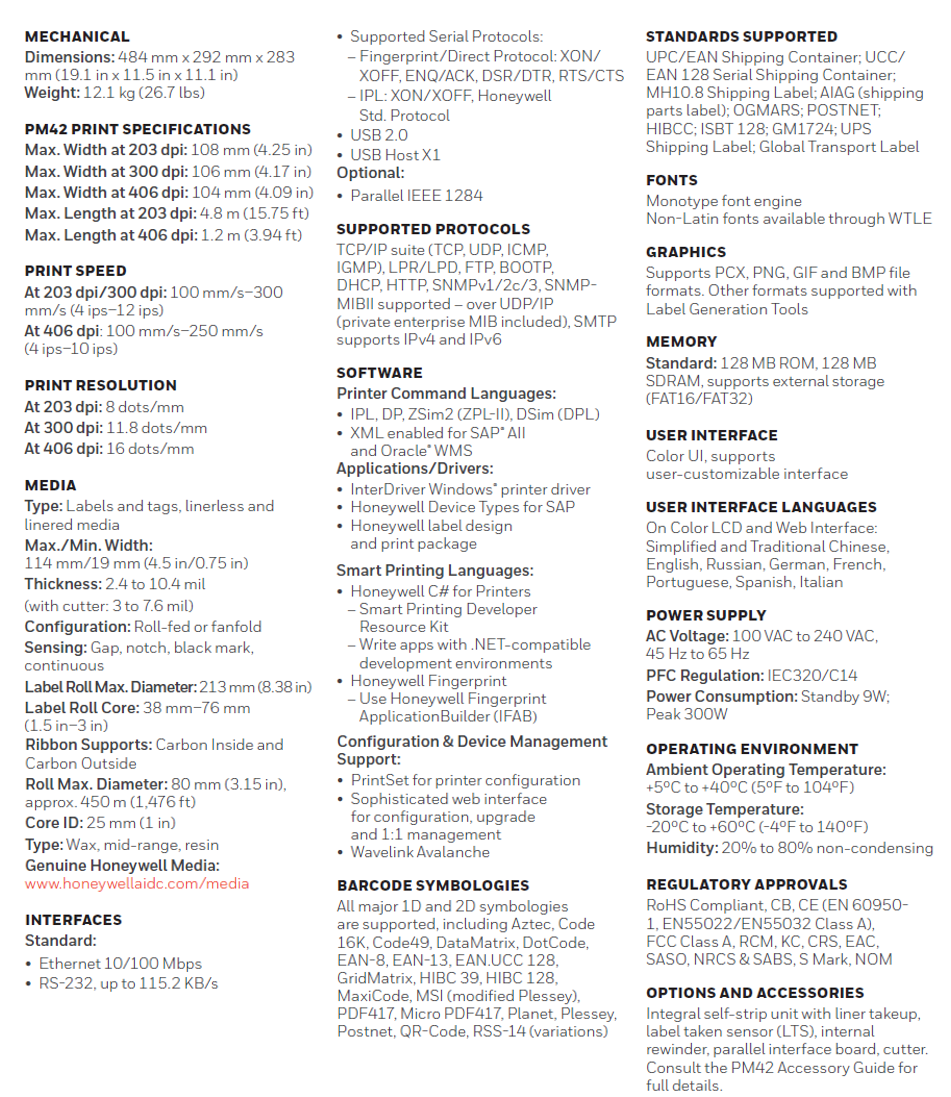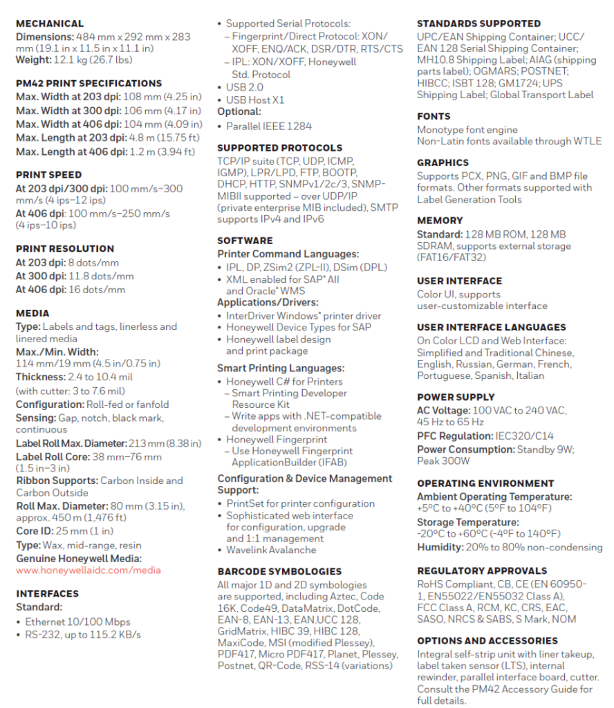 The Honeywell PM42 mid-range industrial label printer is designed for maximum reliability and uptime. With a durable construction and an intuitive, user-friendly interface, it’s ideal for distribution center, warehouse, manufacturing, transportation and retail environments.