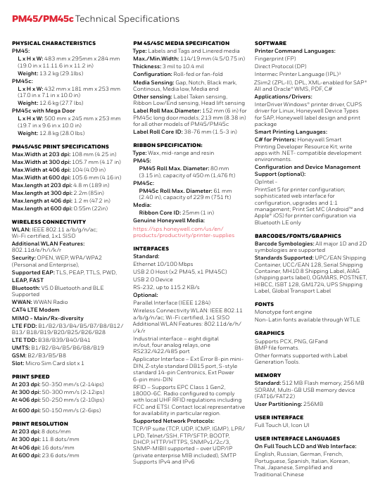 The Honeywell PM45/PM45C are high-performance industrial printers delivering 203 to 600 dpi resolution at speeds up to 14 ips. Featuring a 3.5-inch touch display, they are the first to offer enhanced WWAN connectivity for IoT applications. Built on the Honeywell Printer Edge™ platform, they provide superior print registration ($±0.5$ mm) for precise, high-volume labeling in logistics and manufacturing.