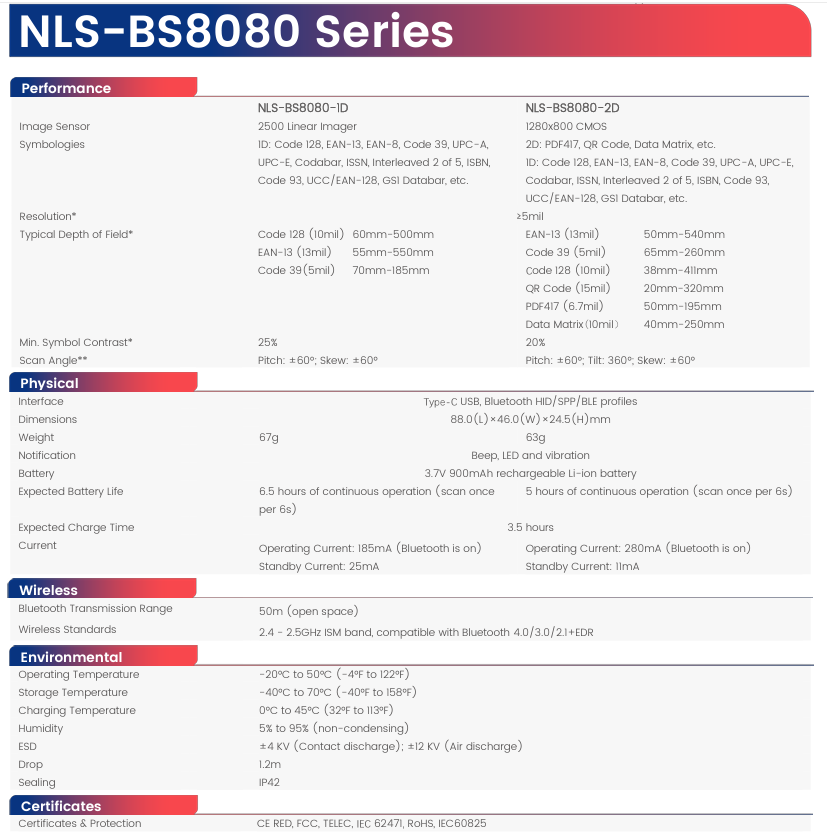 The Newland NLS-BS8080 is a compact wireless Bluetooth 2D barcode scanner built for speed and durability. Featuring Bluetooth 4.0 Class 1, a bright laser aimer, long battery life, and IP42 rugged design, it reliably scans 1D/2D barcodes from paper or screens on iOS and Android devices.