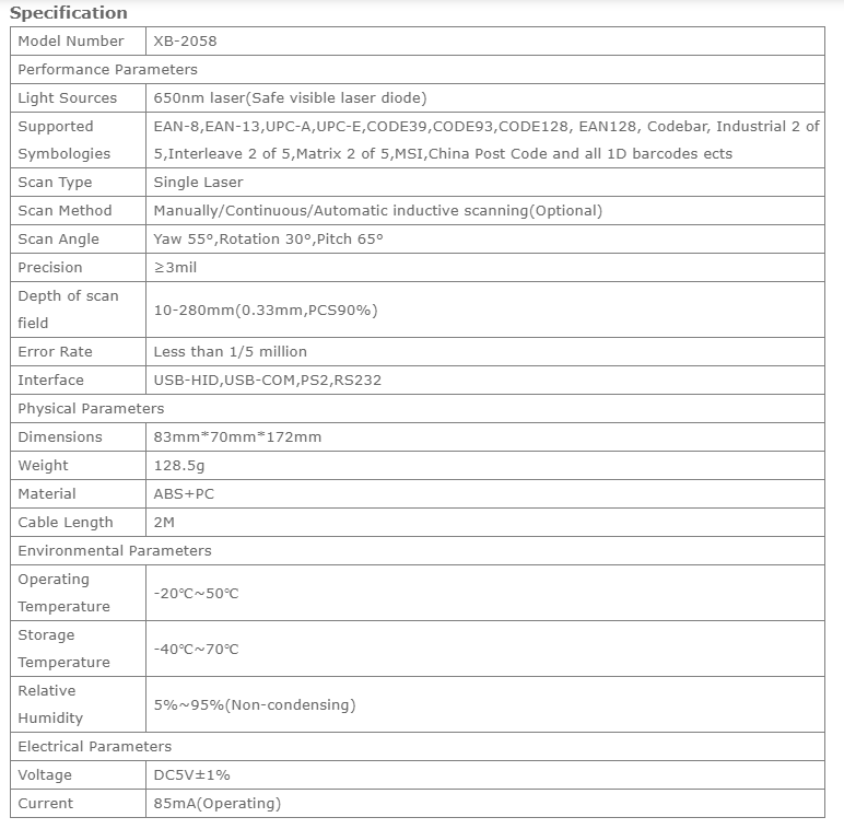 Syble XB-2058 1D Laser Barcode Scanner