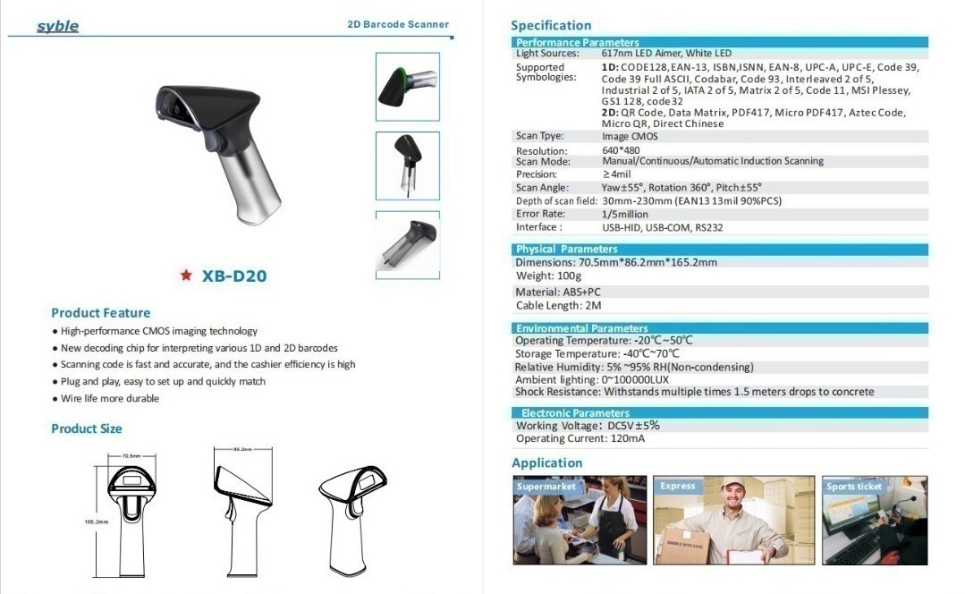 Syble XB-D20 High-Performance Portable Handheld 2D Barcode Scanner
