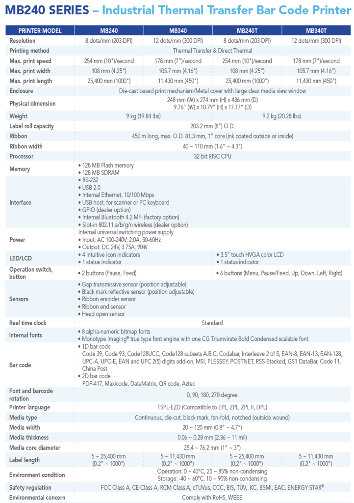 TSC MB240T Industrial Direct Thermal Barcode Label Printer