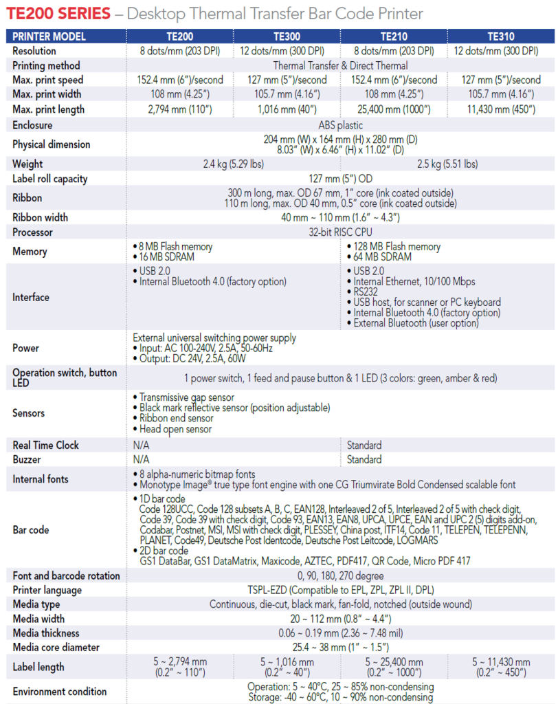 The TSC TE200 is an affordable, high-performance 4-inch desktop label printer built for durability and versatility. It features a fast 400 MHz processor and 152.4 mm/s print speeds, supporting both direct thermal and thermal transfer methods. With its modular design and easy-load mechanism, it’s ideal for manufacturing, healthcare, and retail labeling in demanding environments.