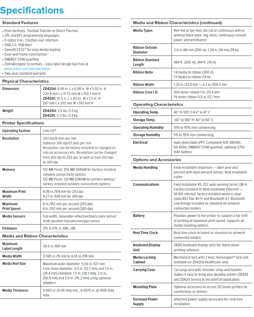 The Zebra ZD420 is a versatile 4-inch desktop printer engineered for simplicity and flexibility in retail, manufacturing, and healthcare. It features a unique, easy-load ribbon cartridge for foolproof 10-second installation and an intuitive five-LED status interface. With field-upgradeable connectivity and 300 dpi options, it ensures high-quality labeling and effortless integration into any existing workflow.